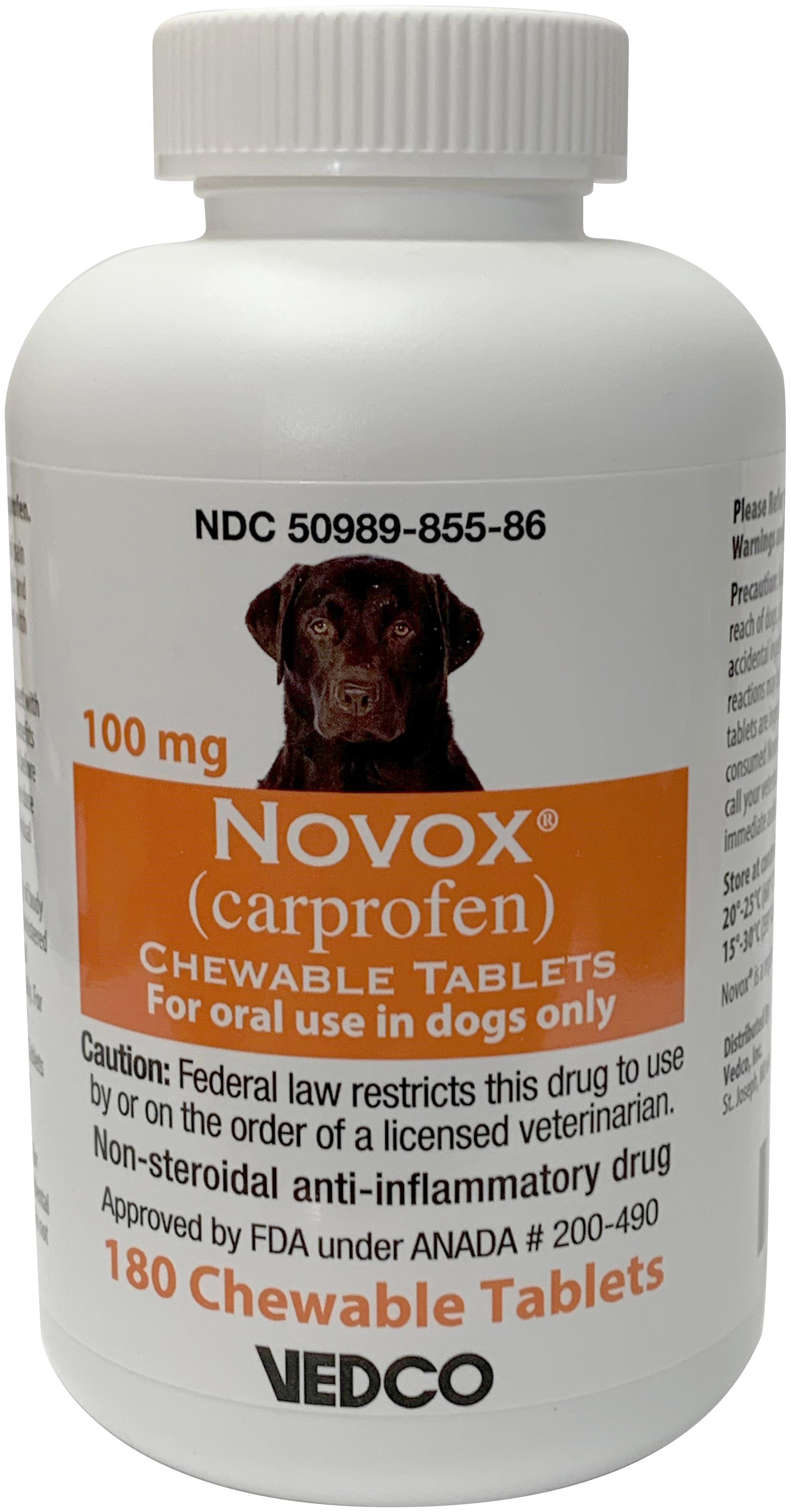Novox chewable tablets are scored, and contain 25 mg, 75 mg, or 100 mg of carprofen per tablet. Each tablet size is packaged in bottles containing 30, 60, or 180 tablets
